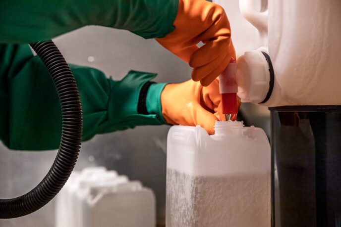 Soms moeten chemische vloeistoffen overgegoten worden in een andere, veelal kleinere verpakking. Dit ‘chemisch omgieten’ wordt bij ons uitgevoerd door getraind en gecertificeerd personeel in een speciaal daarvoor ingerichte ruimte. Dit proces wordt uitgevoerd onder strikte veiligheidsmaatregelen, met alle benodigde persoonlijke beschermingsmiddelen, en volledig conform de geldende wet- en regelgeving.